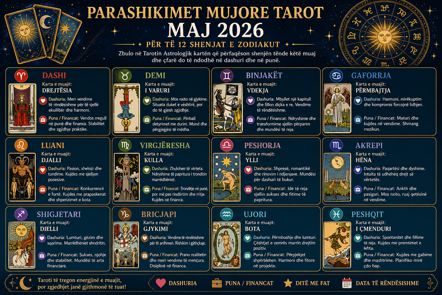 Pas një periudhe me ndryshime të mëdha, paqartësi dhe pasiguri, tani ka ardhur momenti të gjesh përsëri ekuilibrin tënd. Maji është muaji i vendimeve, i mendimit logjik dhe i zgjidhjeve praktike që do të të ndihmojnë të vendosësh rregull në jetën tënde. Karta e Drejtësisë tregon se tani mund të shpërblehesh për përpjekjet e tua, por edhe të përballesh me pasojat e gabimeve apo padrejtësive të së kaluarës. Deri në fund të Majit, do të arrish ta vendosësh jetën në një rrjedhë më të qetë dhe më të qëndrueshme. Ditët e premte janë të rëndësishme për mundësi, ndërsa datat favorizuese janë 2, 6 dhe 11 Maj.